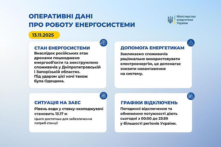 Внаслідок російських атак дронами на енергетичну інфраструктуру – на ранок зафіксовано пошкодження обладнання та знеструмлення споживачів Дніпропетровській і Запорізькій областях. Уночі під ударом також опинилися енергооб’єкти на Одещині. Енергетики оперативно виконують відновлювальні роботи на пошкоджених об’єктах.