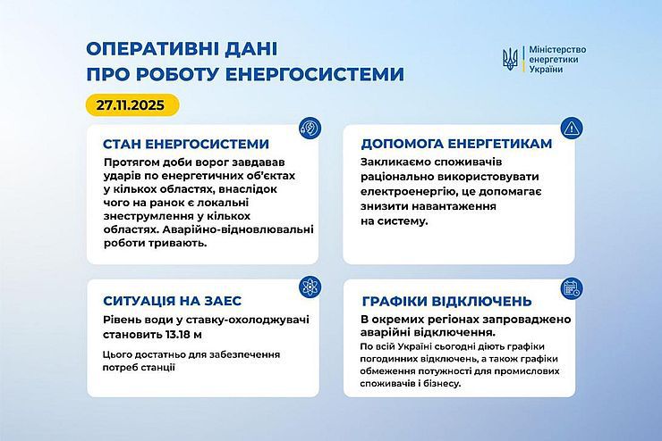 Протягом доби ворог завдавав ударів по енергетичних об’єктах у кількох областях, внаслідок чого на ранок є локальні знеструмлення у кількох областях. Аварійно-відновлювальні роботи тривають, енергетики працюють безперервно, щоб якнайшвидше відновити електропостачання.
