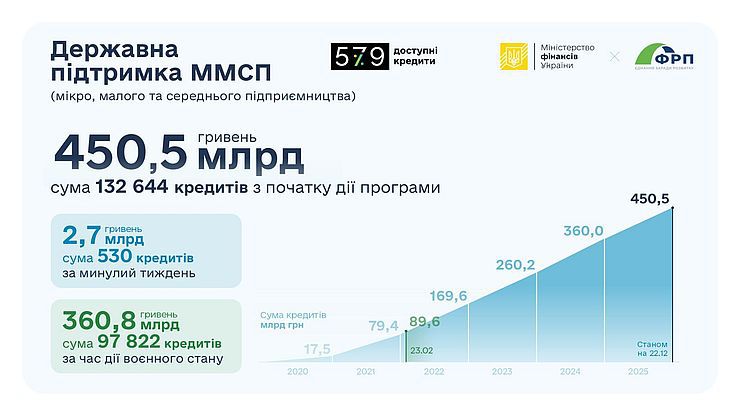 З початку 2025 року за програмою 5-7-9 підприємці отримали 28 187 кредитів на загальну суму 84,4 млрд грн, з яких від банків державного сектору економіки – 20 017 кредитів на 46,1 млрд гривень.