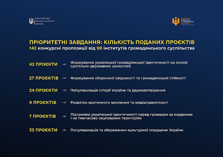• Формування української громадянської ідентичності на основі суспільно-державних цінностей – 42 проєкти