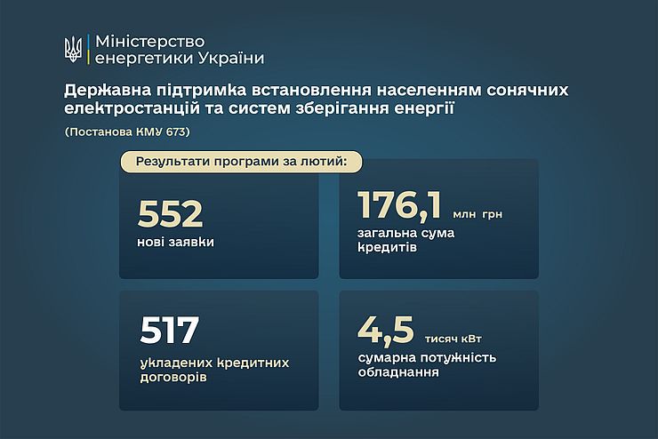 Лише за лютий 2026 року банки отримали 552 нові заявки, з яких підписано 517 кредитних договорів на 176,1 млн гривень. Загальна потужність обладнання за цими договорами становить 4, 5 тисяч кВт.