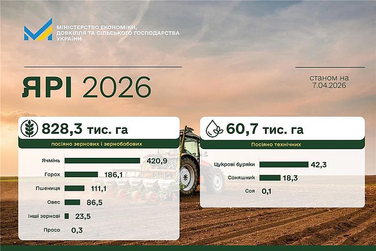 Це 14% від прогнозованих площ. Зокрема, посіяно ярої пшениці – 111,1 тис. га, ярого ячменю – 420,9 тис. га, гороху – 186,1 тис. га та вівса – 86,5 тис. га.