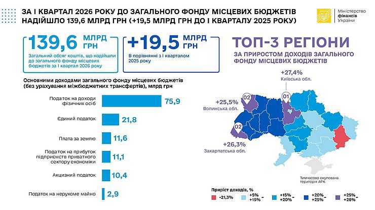 Найвищий приріст доходів загального фонду місцевих бюджетів до I кварталу 2025 року зафіксовано у таких областях: Київська (+27,4%), Закарпатська (+26,3%), Волинська (+25,5%), Івано-Франківська (+22,6%), Тернопільська (22,5%), Вінницька (21,8%), Житомирська (+21,7%), Рівненська (+21,7%), Хмельницька (+21,2%), Львівська (+21,2%) та Чернівецька (21,0%).