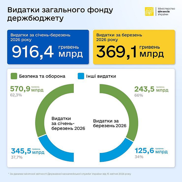 Видатки загального фонду державного бюджету на безпеку і оборону за січень – березень 2026 року становили 570,9 млрд грн, або 62,3% від усіх видатків загального фонду.